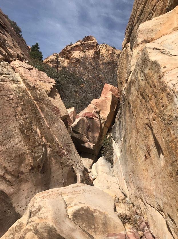 By mile 2.2 you should be following the bouldery creek bed. This is where the fun really begins. You will encounter big rocks to scramble up and slabby slickrock waterfalls. There are cairns here and there that let you know you are going in the correct general direction, but don’t rely on them exclusively because they may lead you astray. (For example: DO NOT follow the cairns up the boulder field on the right side of the canyon around mile 3.5). Your best course of action is to stick to the creek bed, or as close to it as possible, and keep going upstream.